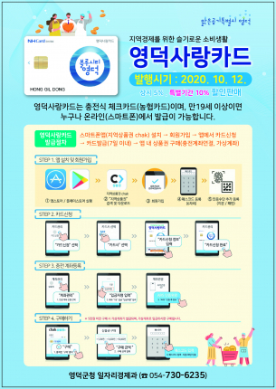 영덕군(군수 이희진)은 한국조폐공사, NH카드와 업무협약을 통해 카드형 영덕사랑상품권 ‘영덕사랑카드’를 10월 12일부터 출시한다고 밝혔다.