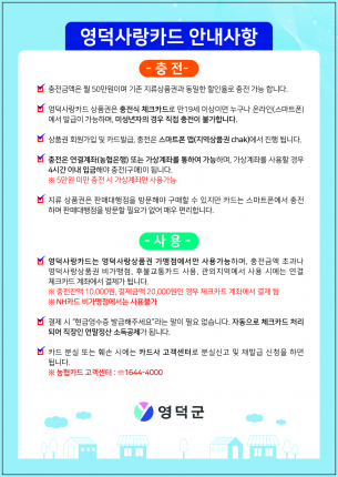 영덕사랑카드에 5,000원, 10,000원, 50,000원 단위로 상품권을 충전하면, 관내 영덕사랑상품권 가맹점 중 NH카드 가맹업소에서 상품권을 카드처럼 사용할 수 있다.