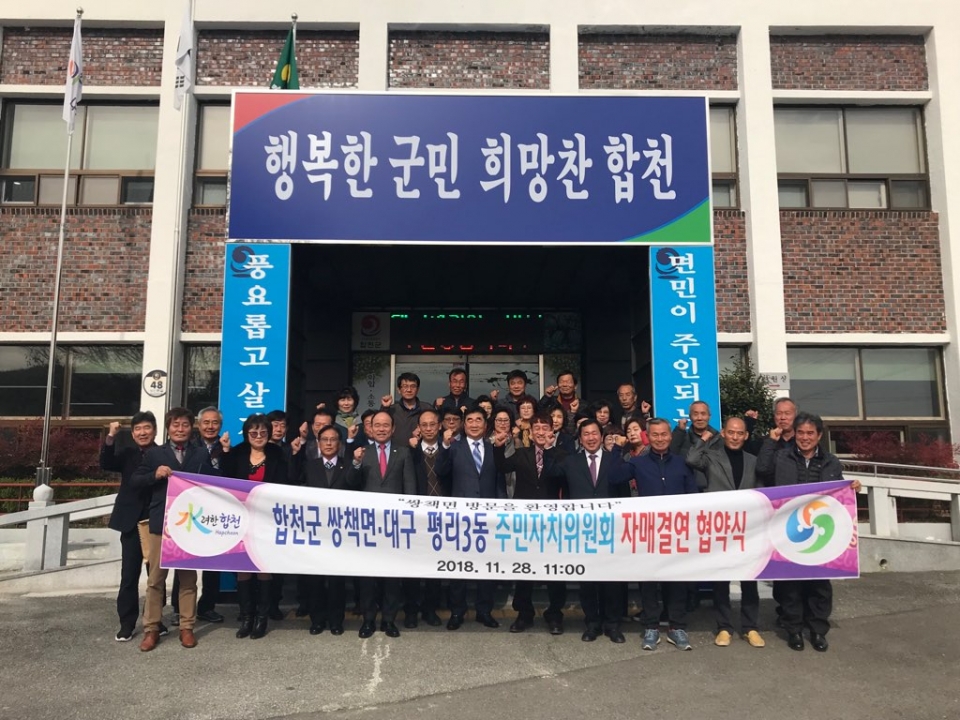 서구 평리3동 주민자치위원회(위원장 정국섭)과 경남 합천군 쌍책면 주민자치위원회(위원장 정화섭)은 지난 28일 오전 합천군 쌍책면서 자매결연행사를 진행했다. 대구에서는 김대웅 동장, 정국섭 주민자치위원장과 위원 등 15명이 쌍책면을 방문했고, 합천군에서는 최진현 쌍책면장, 정봉훈 군의원, 정화섭 주민자치위원장과 위원 등 26명이 참석했다. 이날 협약식을 통해 적극적인 소통과 상호방문 등 지속적인 교류활동을 전개하기로 합의했다.