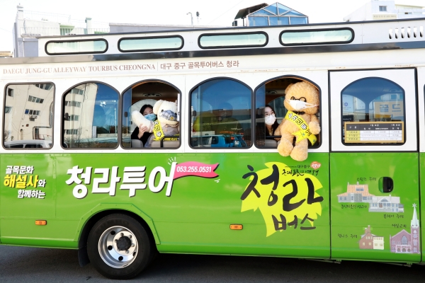 중구청(구청장 류규하)에서 운영하고 있는 중구 도심순환용 투어버스인 청라버스에 타고 있는 ‘거리두기 곰인형’이 눈길을 끌고 있다.