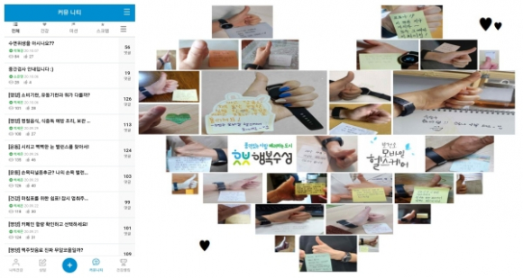 | ↑↑왼쪽 - 모바일 헬스케어의 커뮤니티를 통해 주민들이 영양, 운동 등의 정보를 공유하고 있다. 오른쪽 - 모바일 헬스케어를 통해 주민들이 ‘수성구! 응원첼린지’에 참여하고 있다. |