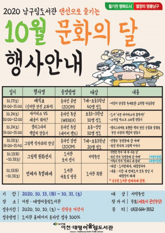 기타 문화의 달 행사에 대한 자세한 안내 및 참가 신청은 남구립도서관홈페이지(https://lib.nam.daegu.kr/main.do) 혹은 이천·대명어울림도서관(☎664-3552)으로 문의하면 된다.