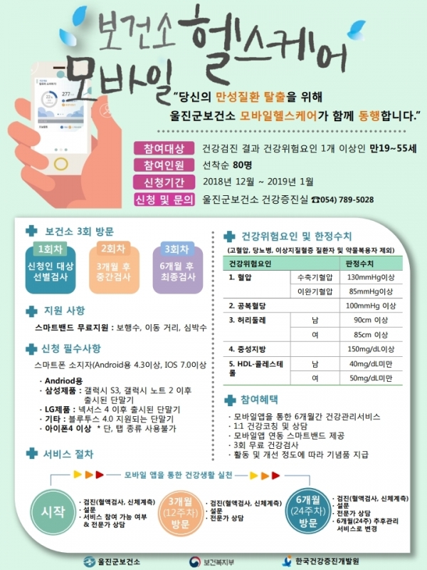 울진군 보건소는 2019년도 모바일 헬스케어 사업 참여자 80명을 오는 12월 3일부터 선착순 모집한다.