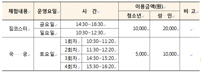 신청방법은 체험 진행 1시간 전부터 화랑마을 육부촌 관리동에서 현장 접수하며, 카드결제만 가능하다. ‘국궁’ 은 7세 이상(7세~11세는 보호자 동행 시 가능), ‘짚코스터’ 는 14세 이상(신장 150cm 이상, 몸무게 90kg 이하)이면 이용 가능하다.