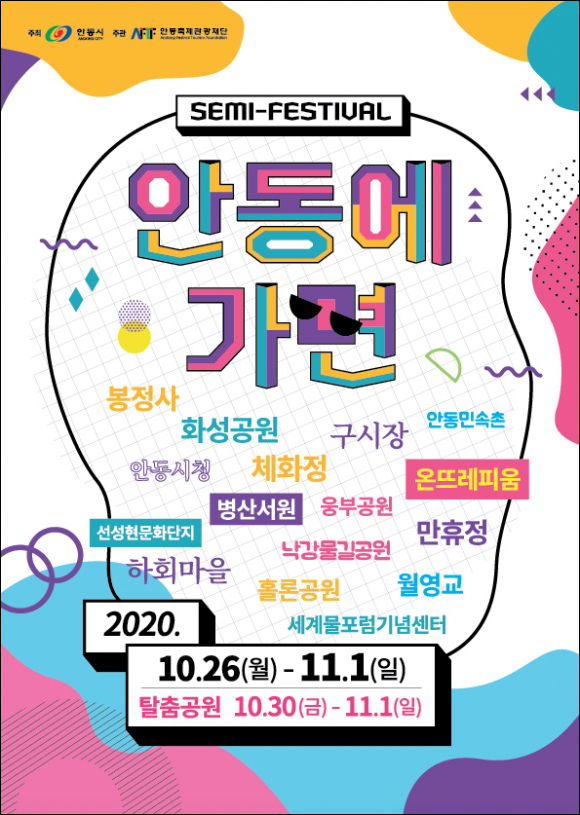2020 특별기획 소규모 문화축제 「Semi-festival, 안동에 가면」이 10월 26일부터 11월 1일까지 7일간 지역주요 관광지 및 지역 문화 공간 일원에서 개최된다.