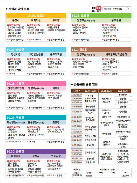 이번 축제는 안동시가 주최, (재)안동축제관광재단이 주관하고 끼와 흥이 넘치는 지역 문화예술인들이 총집합해 그야말로 안동 문화판 페스티벌로 펼쳐진다. 코로나 19로 지친 일상을 뒤로하고 깊어가는 가을날 안동 문화예술인들의 공연을 즐기며 심신을 힐링할 수 있도록 계획되었다.