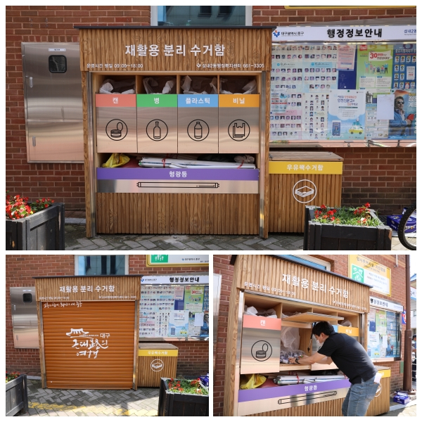 설치된 분리수거함은 멋스러운 외관과 함께 캔·병·플라스틱·비닐·폐형광등·폐종이·우유팩수거함 7종을 분리 수거할 수 있다.