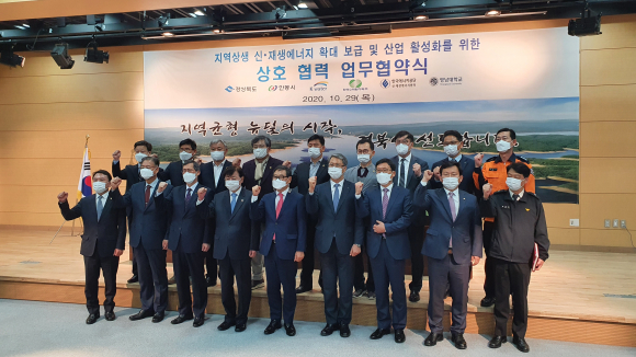 경상북도는 지난 10월 29일 안동시 세계물포럼센터에서 하대성 경상북도 경제부지사, 권영세 안동시장, 박재현 한국수자원공사 사장, 정재훈 한국수력원자력(주) 사장, 이상훈 한국에너지공단 신재생에너지센터 소장, 서길수 영남대학교 총장, 김형동 국회의원, 지역 도의원 등이 참석한 가운데, ‘지역상생 신재생에너지 확대 보급 및 산업 활성화를 위한 상호협력 양해각서(MOU)’를 체결했다.