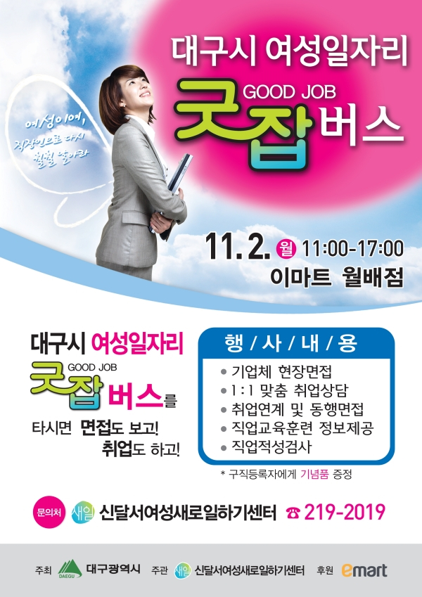 대구 달서구 신달서여성새로일하기센터는 11월 2일 오전 11시부터 오후 5시까지 이마트 월배점에서 코로나 19로 구직활동에 어려움을 겪는 지역 여성들을 위해 찾아가는 취업상담 ‘굿잡(good job)버스’를 운영한다.