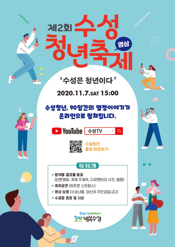 수성 청년축제는 지난해부터 개최한 행사로, 청년들이 직접 만든 문화 콘텐츠를 활용하는 축제이다. 이번 행사는 코로나19 예방을 위해 영상축제 형태로 진행되며, 수성구청 공식 유튜브채널인 ‘수성TV At Suseong’를 통해 실시간 송출된다.