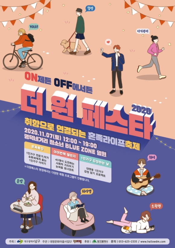대구광역시 남구(구청장 조재구)에서는 오는 7일(토) 명덕네거리 청소년 블루존에서 1인 가구 축제 「2020 더 원 페스타 : 취향으로 연결되는 혼족라이프」를 개최한다.