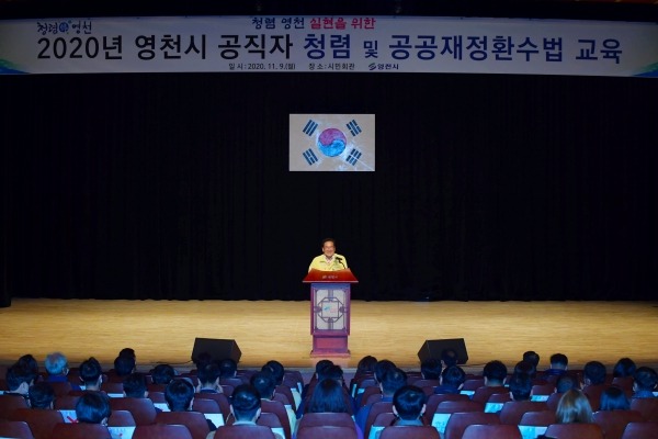 영천시(시장 최기문)는 지난 9일 시민회관에서 신규, 승진자 및 고위직 공직자 등 직원 300여 명을 대상으로 전문강사를 초청해 청렴 및 공공재정환수법 교육을 실시했다.