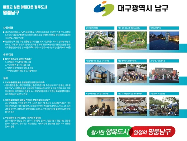 조재구 남구청장은 “지역산업진흥 및 국가균형발전을 위한 우리 남구의 노력이 지자체 우수사례로 선정되어 이번 박람회에 대구지역을 대표하여 전시되는 등 결실을 맺었다.”며 “앞으로도 지역 특성에 맞는 창의적인 사업 발굴 등을 적극적으로 추진하여 주민이 행복한 지역 혁신을 이루겠다.”고 말했다.