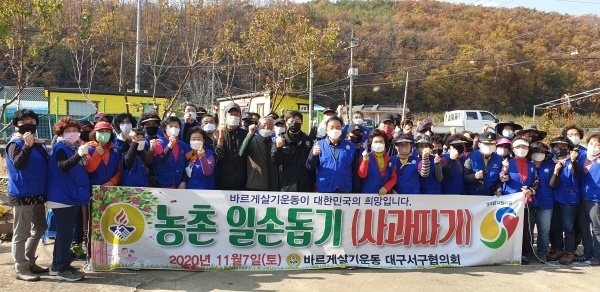 대구 서구 바르게살기운동 서구협의회(회장 손미호)는 7일 영천시 화남면에서 사과따기 등 농촌일손돕기 봉사활동을 실시했다.