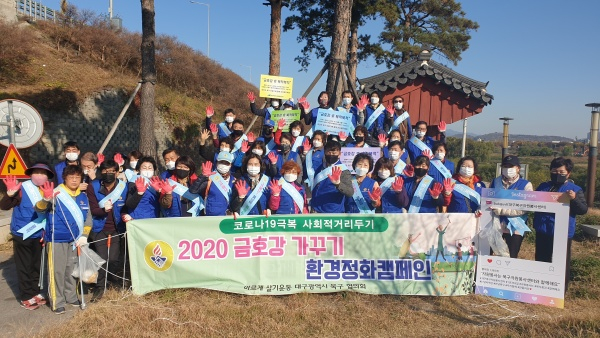 대구 북구자원봉사센터는 북구 지역의 환경을 개선하여 아름다운 도시 이미지를 제고하고, 코로나19의 확산으로 위축된 자원봉사활동에 재활력을 불어넣기 위해 11월 한달 간 금호강애(愛) 북적북적 환경정화활동을 실시하고 있다.