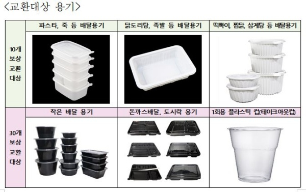 이번 사업은 기존의 폐건전지 및 종이팩 보상교환사업과 병행하여 각 동 행정복지센터에서 접수 및 교환을 실시하고 있으며, 주민이 사용한 배달용기(大) 10개나 배달용기(小) 또는 1회용 플라스틱 컵 30개를 모아 가져가면 종량제 봉투 20L 1매로 보상 교환해준다.