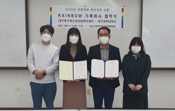 대구 북구청소년상담복지센터(박수진 센터장, 이하 센터)와 대구과학대학교(총장 박준)는 11월 12일(목 )‘레인보우 가족회사 MOU’를 체결했다.