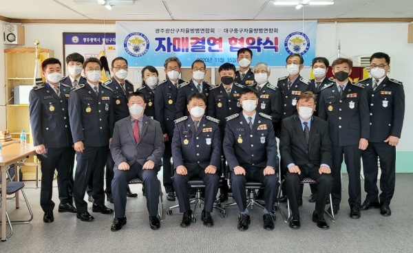 대구 중구 자율방범연합회(회장 김득환)는 지난 15일 광주 광산구 자율방범연합회(회장 양성래)와 자매결연 협약식을 맺었다고 밝혔다.중구 및 광산구 자율방범대원 20여 명은 이날 광산구 자율방범연합회 사무실에서 자매결연 협약식을 맺고 상호 교류를 통한 지역안전에 최선을 다하기로 다짐했다.