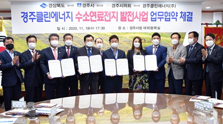 경북도와 경주시는 18일 경주시청 대외협력실에서 이철우 도지사, 주낙영 경주시장, 임민규 경주클린에너지 대표, 지역 도의원 및 시의원 등이 참석한 가운데 ‘경주클린에너지 수소연료전지발전소 건립’ 투자양해각서(MOU)를 체결했다.