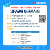 토크콘서트에는 강은희 대구시교육감, 박한우 교수(영남대 언론정보학과), 학부모 대표 이희숙(대구경동초), 학생 대표 노하선(경북대학교사범대학부설고), 교사 대표 유상은(심인중)의 총 5명의 패널이 출연해 ▲코로나19 사태, 혼란에 빠진 교육현장, ▲코로나19로 변화된 교육현장, ▲위드코로나 시대, 새로운 대구교육의 길을 찾다 등을 주제로 다양한 의견을 나눌 예정이다.