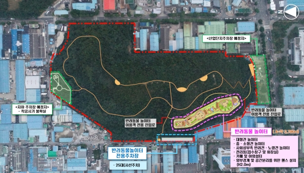 타당성조사 기본구상 용역(안)에 따르면 성서산업단지내 장동공원 남측인 장동 산 28번지 일원에 3,700㎡ 규모의 놀이터 시설에 소형 및 중·대형견 공간분리를 위한 경계휀스 설치 및 보호자 쉼터, 반려견 놀이시설, 진입로 개설, 관리사무소 등 기반시설 설치, 산책로 조성, 묘지이장 등에 사업비 17억원정도가 소요될 예정이다.