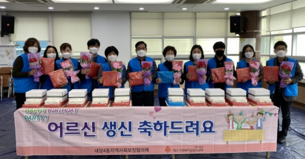 대구 서구 내당4동지역사회보장협의체(위원장 박상석)는 지난 18일 코로나19로 인해 소외되고 외로운 홀몸어르신 10세대를 직접 방문해 생신 축하와 선물꾸러미(떡, 케익, 꽃다발, 내의, 양말)를 전달하는‘함께해요! 축복의 날’생신축하 행사를 실시했다.