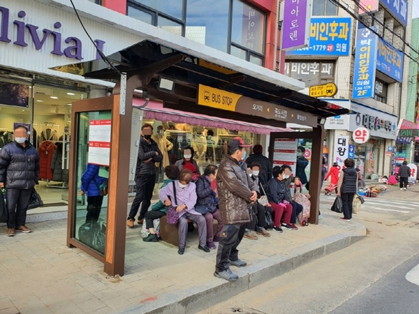 포항시는 시내버스를 이용하는 시민들에게 편의를 제공하기 위해 이용객이 많은 죽도시장 버스정류장에 지붕이 있는 유개승강장을 설치했다.