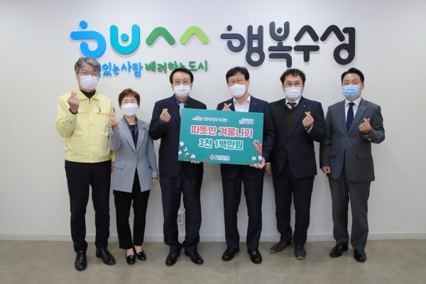 대구사회복지공동모금회(회장 김수학)는 지난 26일 수성구청을 방문해 저소득 주민들이 따뜻한 겨울을 보낼 수 있도록 난방비 3,120만 원을 전달했다.