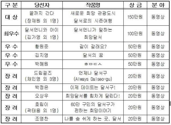 대상은 선사유적지로 떠난 과거로의 시간여행을 담담한 내레이션과 함께 담은 동영상 작품 ‘새로운 희망 관광도시 달서로의 시즌여행’에 돌아갔으며, 심사위원들로부터 공모주제에 대한 이해도가 높고 작품성이 돋보인다는 평가를 받았다.