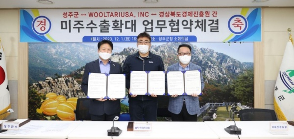 성주군은 12월 1일(화) 경상북도 경제진흥원과 미국 울타리USA사 간 미국 수출 확대를 위한 상호 협약을 체결하였다.