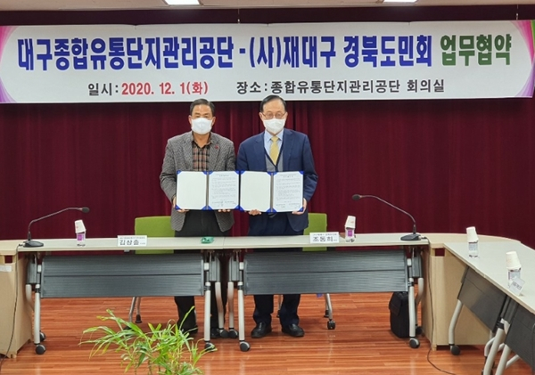 12월 1일(화) 17시 대구종합유통단지관리공단 회의실에서 대구종합유통단지관리공단과 (사)재대구경북도민회는 상호협력과 상생발전을 위하여 업무협약을 체결하였다.