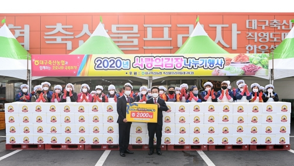 대구축산농협 축산물프라자 동대구IC점(조합장 최성문)은 지난 2일 동절기를 맞아 지역의 저소득 가정에 사랑의 김장 김치 2,000kg(1천만 원 상당)를 전달하였다.