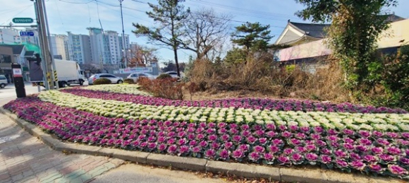올해 초 원화로 선덕네거리 가로수 사이에 심은 상록관목인 남천이 붉게 물들면서, 이번에 식재한 꽃양배추와 함께 아름다운 조화를 이루고 있다.