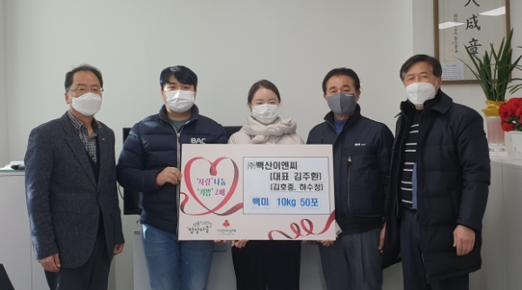 | ↑↑ ㈜백산이엔씨가 어려운 이웃을 위해 쌀 50포를 상동행정복지센에 전달하고 기념촬영하고 있다. |
