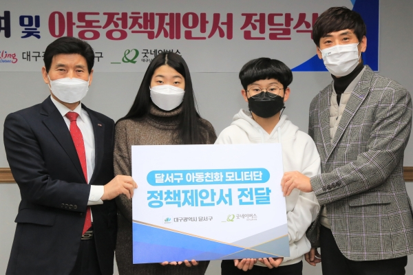 대구 달서구(구청장 이태훈)는 제1기 달서구 아동친화모니터단과 굿네이버스 대구남부지부(안정하 지부장)에서 지난 15일 아동친화모니터단원들이 제안하고 선정한 정책제안서를 달서구에 전달하였다고 밝혔다.