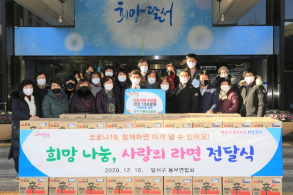 대구 달서구(구청장 이태훈)는 통우연합회(회장 김성미)에서 12월 16일 코로나19 장기화로 어려움을 겪는 달서구 취약계층을 위해 라면 100박스를 전달하며 따뜻한 나눔을 실천했다고 밝혔다.