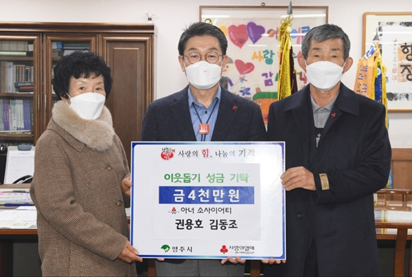 영주시(시장 장욱현)는 12월18일 오전 11시 30분 시장실에서 지역의 어려운 이웃을 위해 써달라며 안정면 권용호(영주 아너 소사이어티 8호), 김동조(영주 아너 소사이어티 9호) 부부가 성금 4천만원을 기탁했다고 밝혔다.