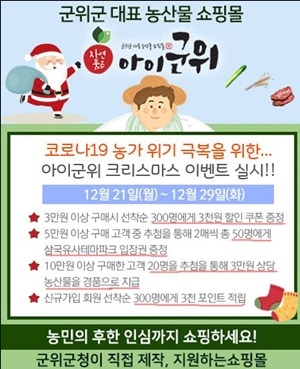 군위군 농·특산물 대표 쇼핑몰인 아이군위 (http://igunwi.gunwi.go.kr/)가 올해 마지막 이벤트를 12월 21일부터 실시한다. 이벤트명은 "아이군위 크리스마스 이벤트"이며 21일(월)부터 29일(화)까지 진행된다.