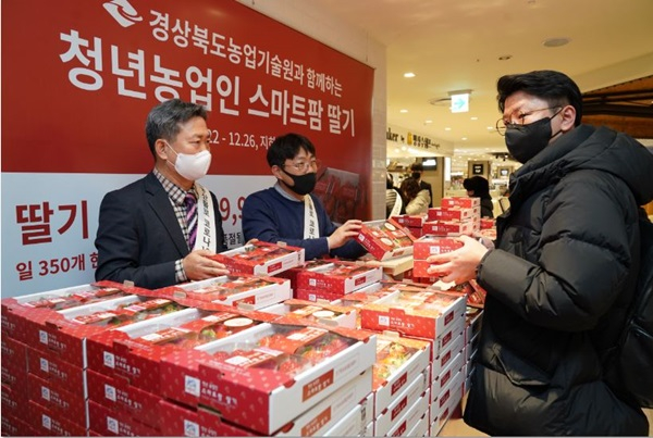 경상북도농업기술원은 의성 이웃사촌시범마을 「청년농업인 스마트팜」에서 첫 수확한 딸기를 롯데백화점(대구점) 식품관에서 12월 22일부터 5일간 홍보한다.
