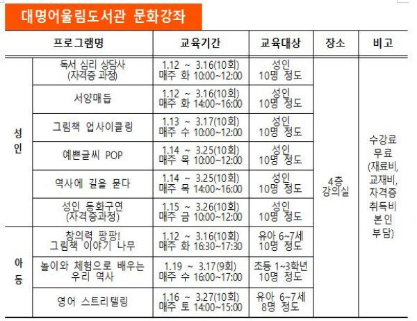 대명어울림도서관(남구 두류공원로 38-1)에서는 성인을 대상으로, ▲독서 심리 상담사 ▲서양매듭 ▲그림책 업사이클링 ▲예쁜글씨 POP ▲역사에 길을 묻다 ▲성인동화구연을 운영하고,