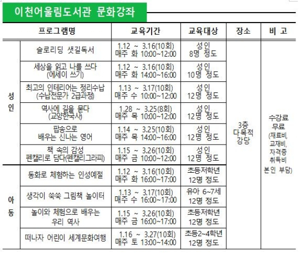 이천어울림도서관(남구 이천로 124)에서는 학부모 등 성인을 대상으로 ▲슬로리딩 샛길독서 ▲세상을 읽고 나를 쓰다 ▲최고의 인테리어는 정리수납 ▲역사에 길을 묻다 ▲팝송으로 배우는 신나는 영어 ▲책 속의 감성 펜캘리로 담다를 운영하고,
