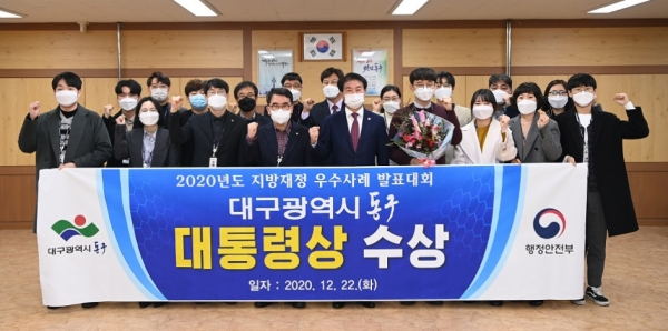 대구동구청(구청장 배기철)은 지난 17일 행정안전부 주관으로 개최된 『2020년도 지방재정 우수사례 발표대회』에서 대통령상을 수상하여 시상금으로 지방교부세 2.5억 원을 받아, 지난해 국무총리상 수상에 이은 쾌거를 이루었다.