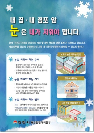 김천시(시장 김충섭)는 겨울철 폭설로 인한 시민의 인명 및 재산피해를 줄이는 방안으로 시민 스스로 방재의식 고취와 안전을 확보하기 위한 ‘내 집, 내 점포 앞 눈치우기’집중 홍보에 나섰다.
