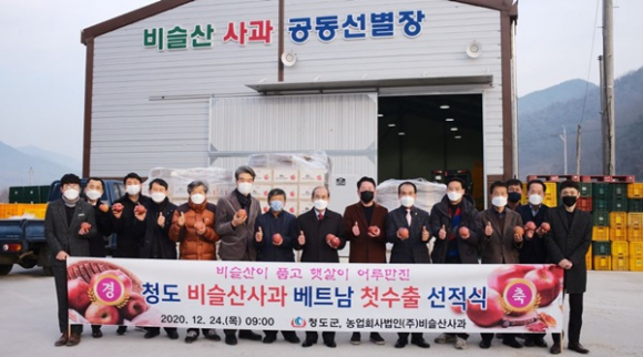 청도군(군수 이승율)과 농업회사법인(주)비슬산사과(대표 이상술)는 수출회사 화랑인터네셔날과 협업하여 청도에서 생산된 비슬산사과를 베트남으로 첫 수출을 하기 위해 12월 24일 각북면 삼평리에 위치한 청도비슬산사과작목반 공선장에서 수출 선적식을 가졌다.