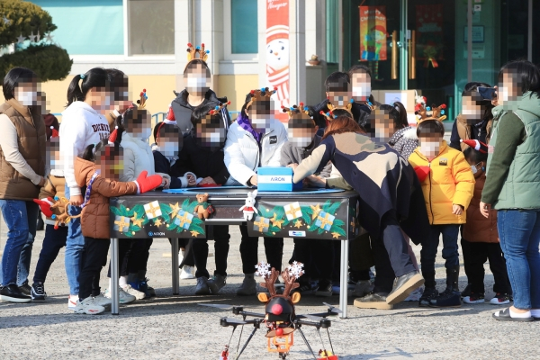 | ↑↑ 아이들이 산타드론이 내려놓은 선물을 열어보고 있다. |