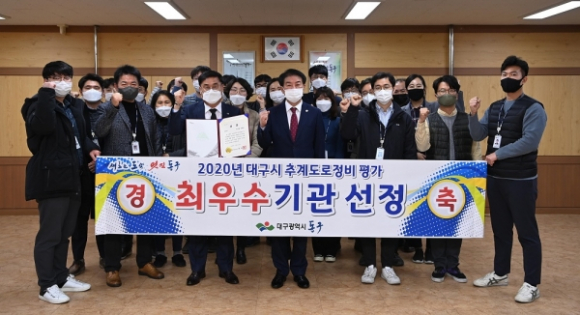 대구 동구청(구청장 배기철)은 대구시 주관으로 12개 기관(8개 구·군, 시설안전관리사업소, 대구시설공단, 대구동부순환도로㈜, 대구남부순환도로㈜)을 대상으로 실시한 ‘2020년 추계도로정비 평가’에서 최우수기관으로 선정됐다. 2018년 최우수기관상, 2019년 장려상에 이어 3년 연속 수상의 영예를 안았다.