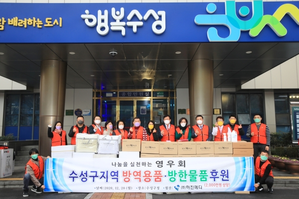 나눔을 실천하는 봉사단체 영우회(회장 김영태)는 지난 28일 수성구청을 방문해 어려운 이웃들을 위한 코로나19 방역물품과 이불 등 물품(2천만 원 상당)을 전달했다. 수성구청은 이 물품을 종합사회복지관 5개소에 배부해 관내 소외계층을 위해 사용할 예정이다.