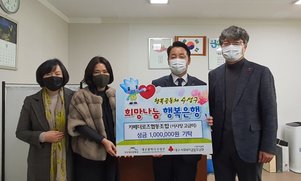 카페더로즈협동조합(이사장 고금미)은 지난 28일 수성구청을 방문해 어려운 이웃들을 위한 성금 100만 원을 전달했다. 카페더로즈협동조합은 수성여성클럽에서 바리스타 교육을 받은 이수자들이 카페를 설립해 운영하고 있는 여성친화적 공동체로 매년 성금을 기부하고 있다.