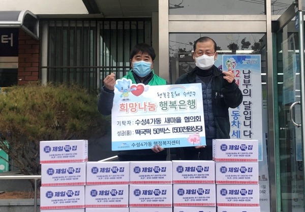 대구 수성구 수성4가동 새마을협의회(회장 이인석)는 지난 28일 수성4가행정복지센터를 방문해 어려운 주민들에게 전달해 달라며 떡국떡 50박스, 마스크 200매(58만 원 상당)를 기탁했다.