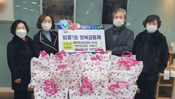 | ↑↑ 범물1동 범물제일교회는 떡국떡 50박스, 이웃돕기 성금 50만 원을 전달. |